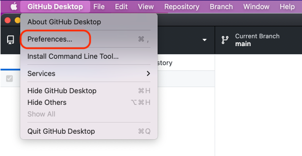 - 상단의 [Github Desktop] 메뉴에서 [Preferences]를 클릭합니다.