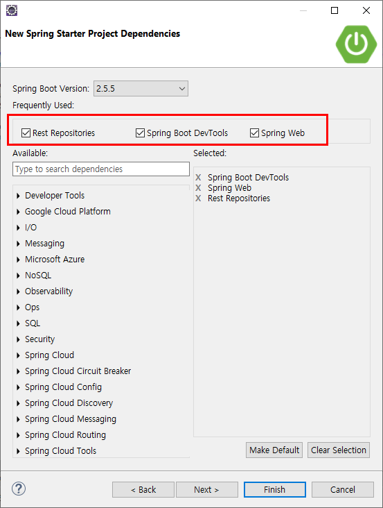- 다음 화면에서 다음 Dependency 들을 선택합니다.(검색창에서 조회하시면 됩니다)