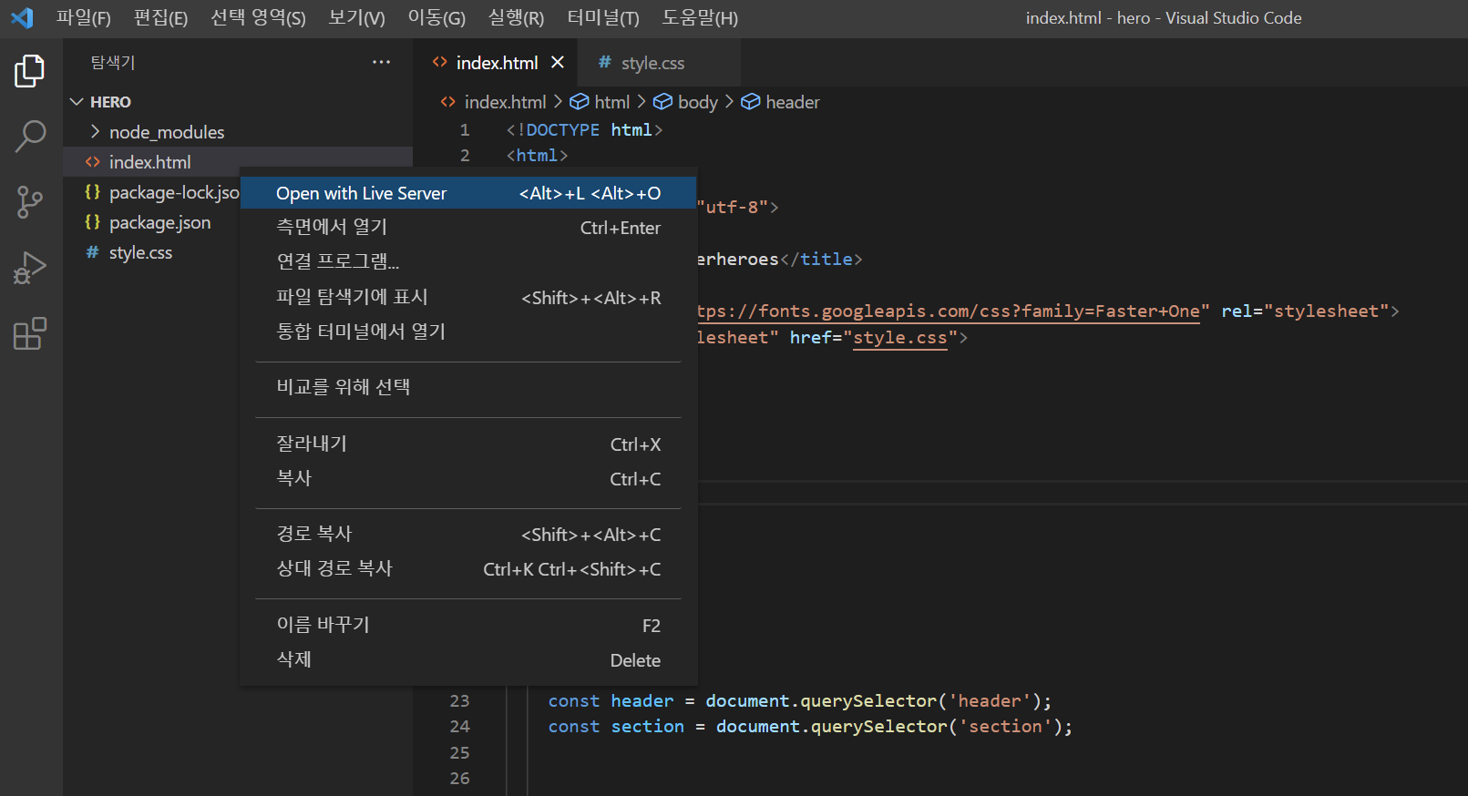 - VSCode의 탐색기에 index.html을 마우스를 우클릭하여 LIve Server를 실행합니다.
