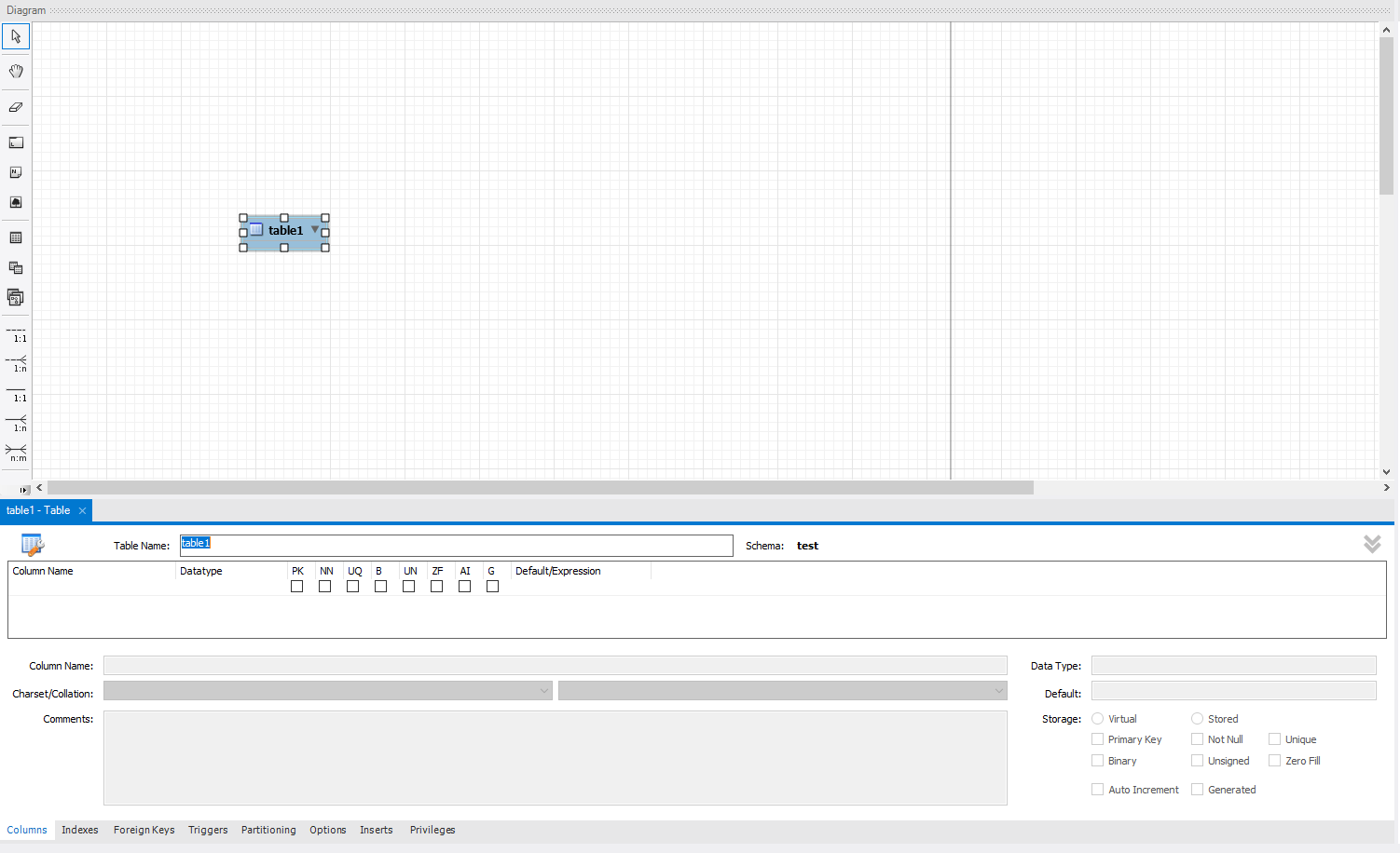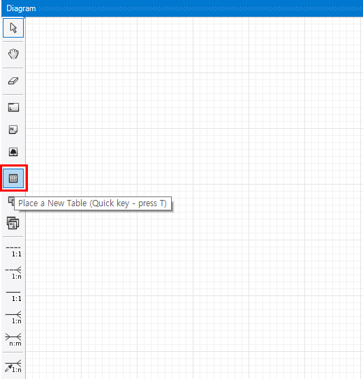 New Table - 마우스를 다이어그램 내부에 클릭하면 Table이 생성 되고, 생성된 Table을 더블 클릭하면 Table 설정 창이 하단에 나타납니다.