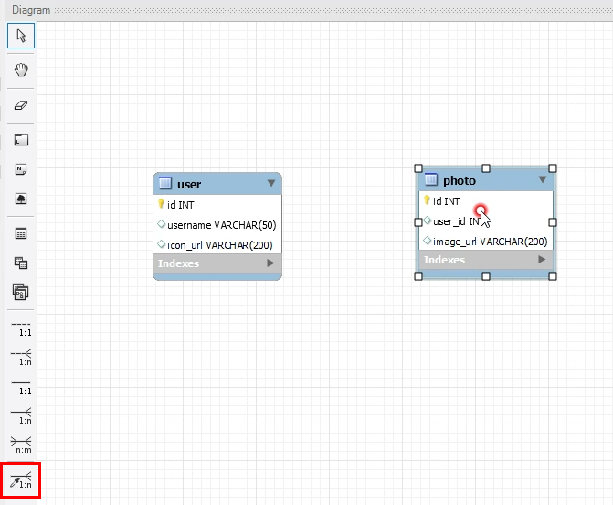 photo table - Foreign key 설정을 위해 스포이드 그림이 있는이 있는 1:n 아이콘을 선택합니다.