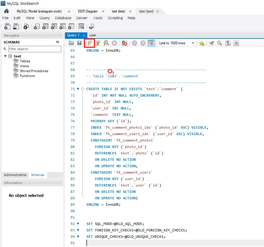 database connection - 해당 Script를 붙여넣기 한 후, 실행 아이콘을 클릭합니다.
