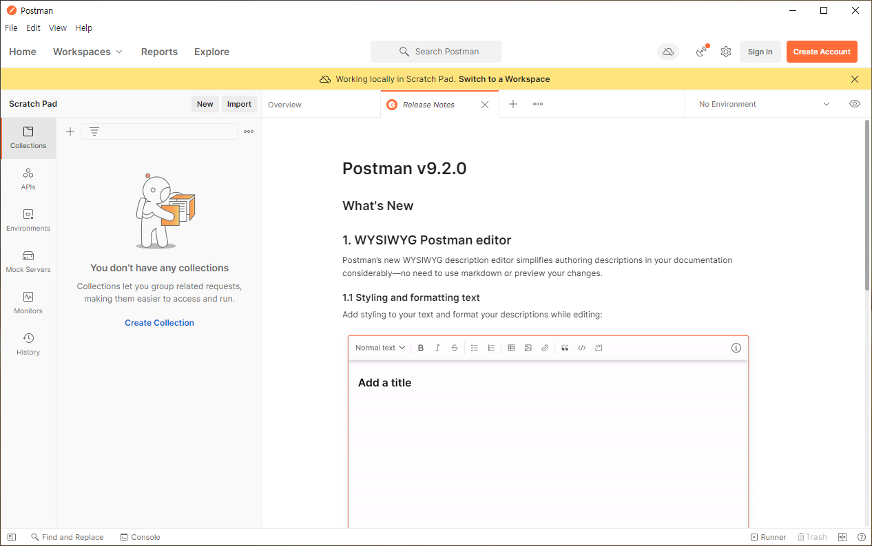 - 설치가 완료되면 아래와 같이 postman이 실행됩니다.