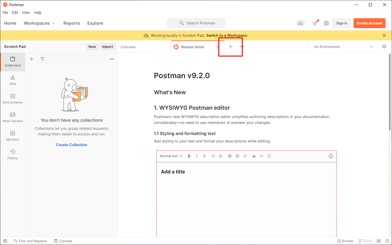 - postman 첫화면에서 "+" 탭을 클릭해서 새로운 요청을 만듭니다.