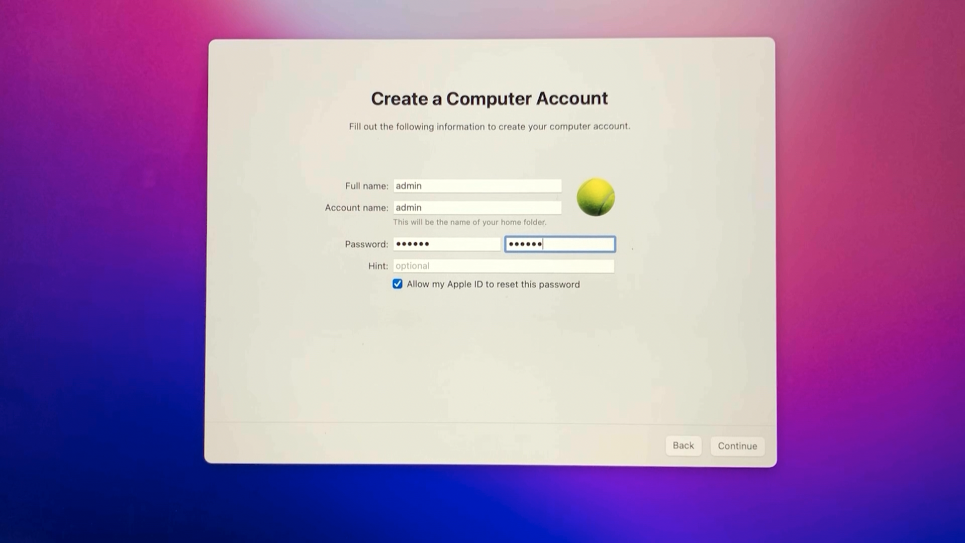 맥의 사용자 계정과 패스워드를 입력하고, Continue 버튼을 클릭합니다.