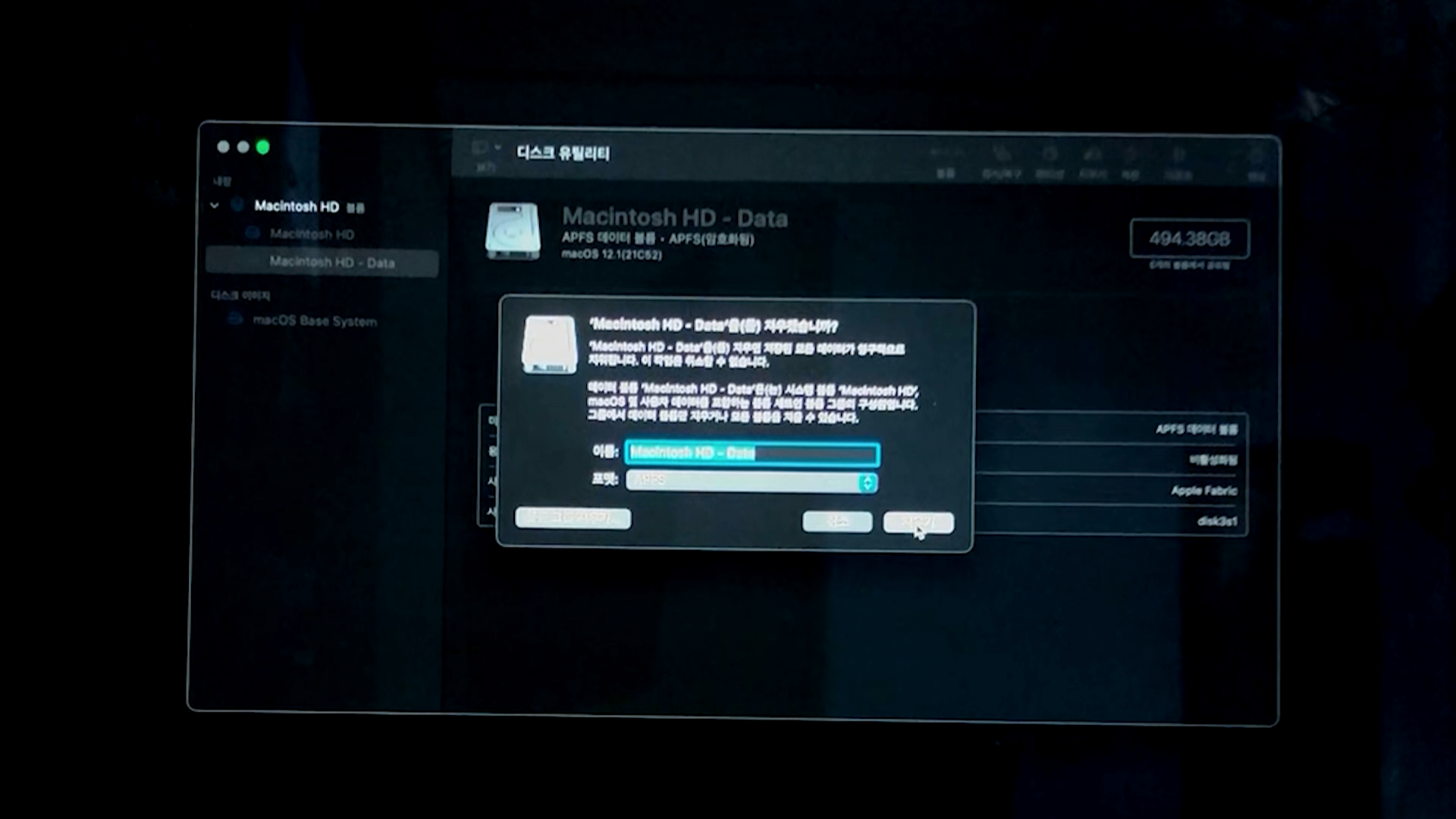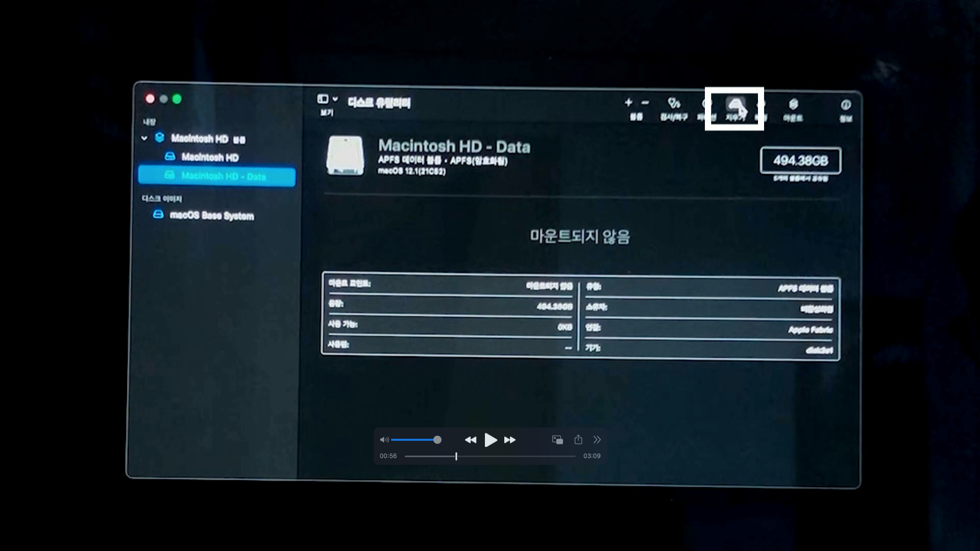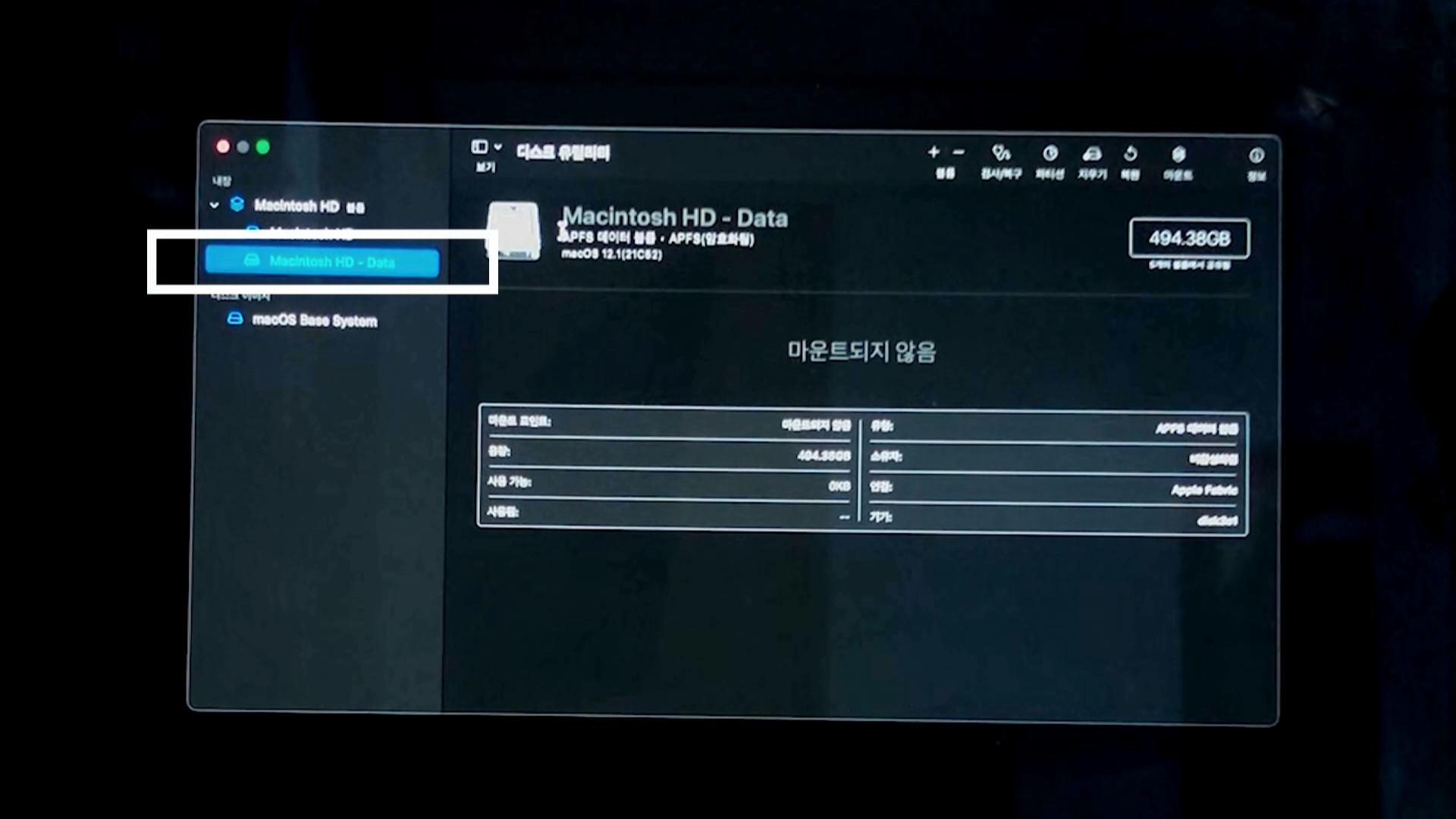 디스크 유틸리티 화면에서 좌측의 "Machintosh HD - Data"를 선택합니다.