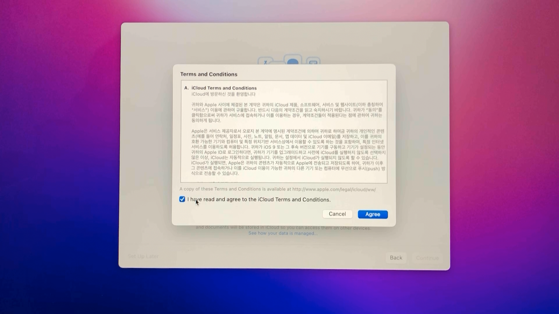 iCloud 약관 동의에 체크하고, Agree 버튼을 클릭합니다.