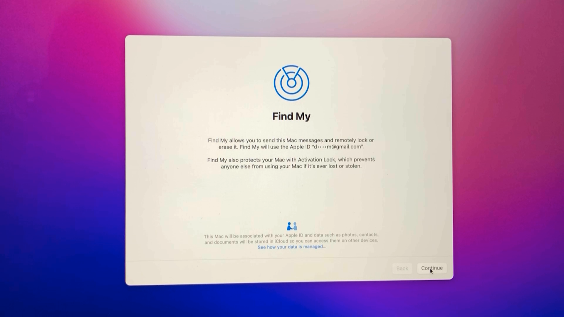 Find My 화면에서 Continue 버튼을 클릭합니다.