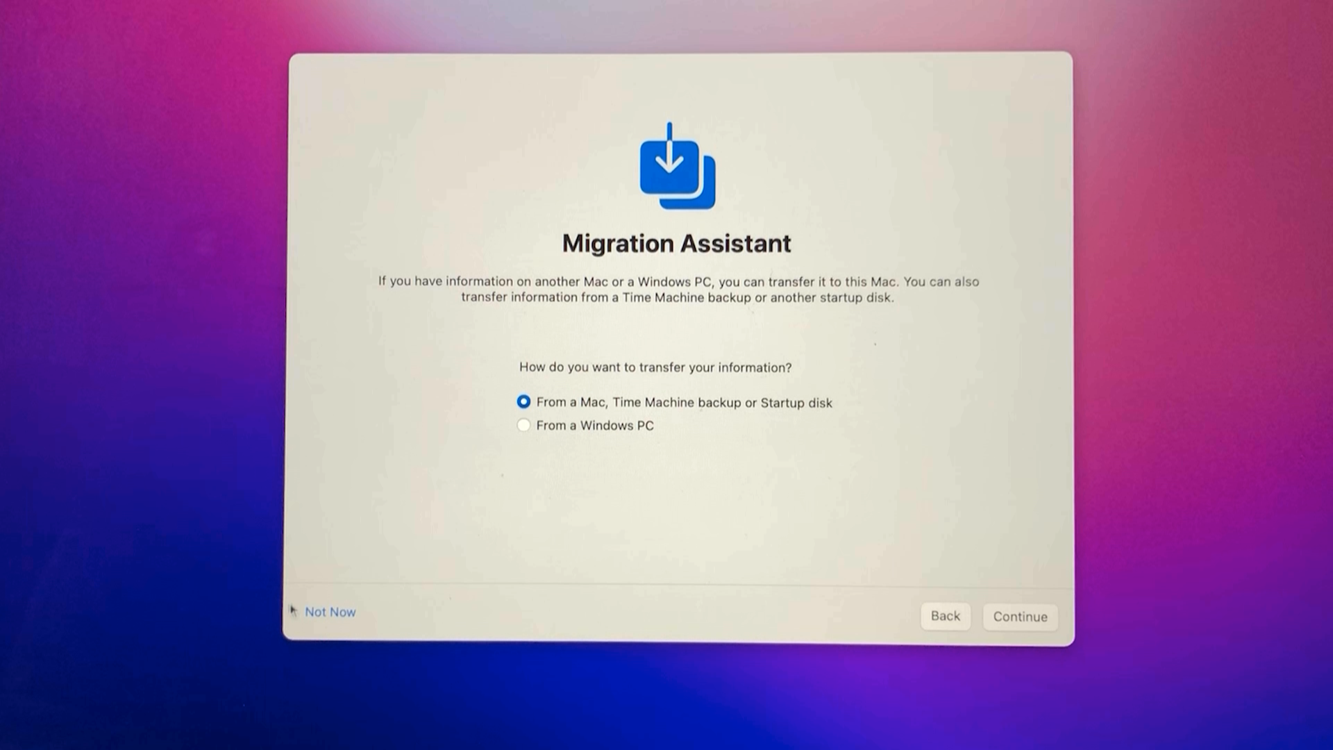 Migration Assistant 창에서는 좌측하단의 Not Now를 클릭합니다.