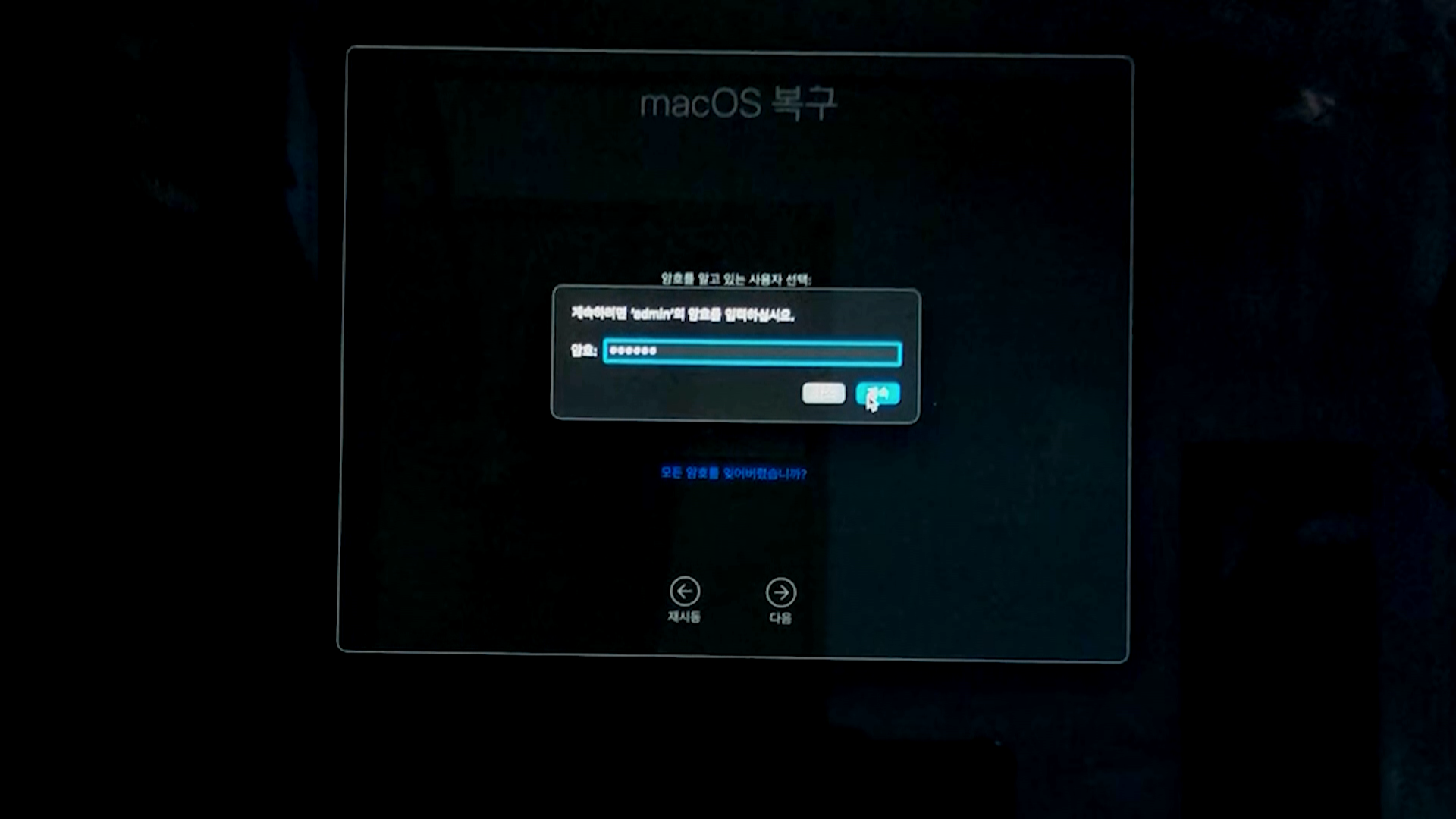 맥OS 복구 창에서 이전 사용자 암호를 입력합니다.
