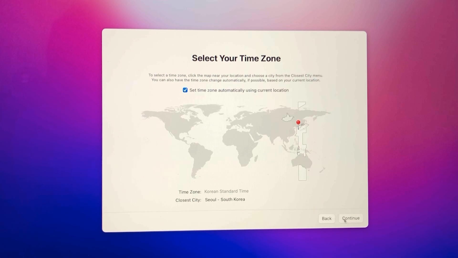 Select Your Time Zone에서는 Set time zone automatically 에 체크하고 Continue 버튼을 클릭합니다.