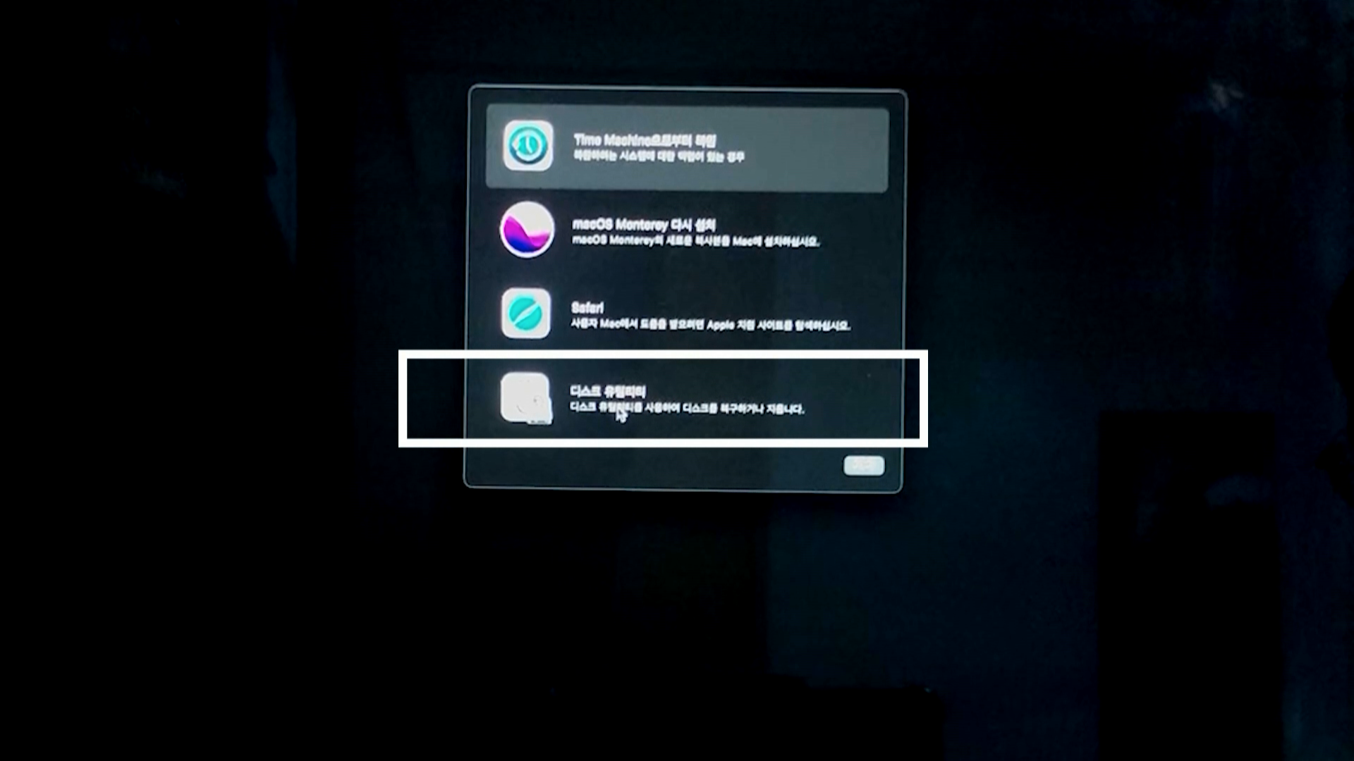 4개의 옵션 창이 나오면 제일 하단의 디스크 유틸리티를 선택하고 계속버튼을 클릭합니다.