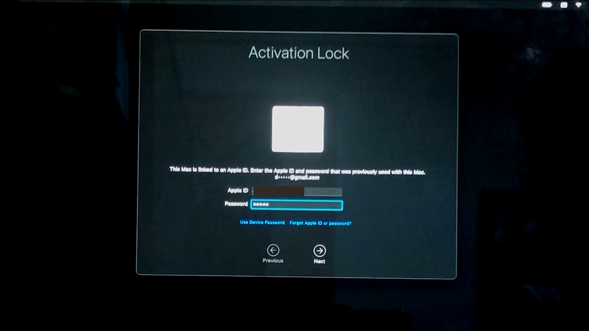 Activation Lock 화면에서 Apple ID와 비밀번호를 입력하고 Next를 클릭합니다.