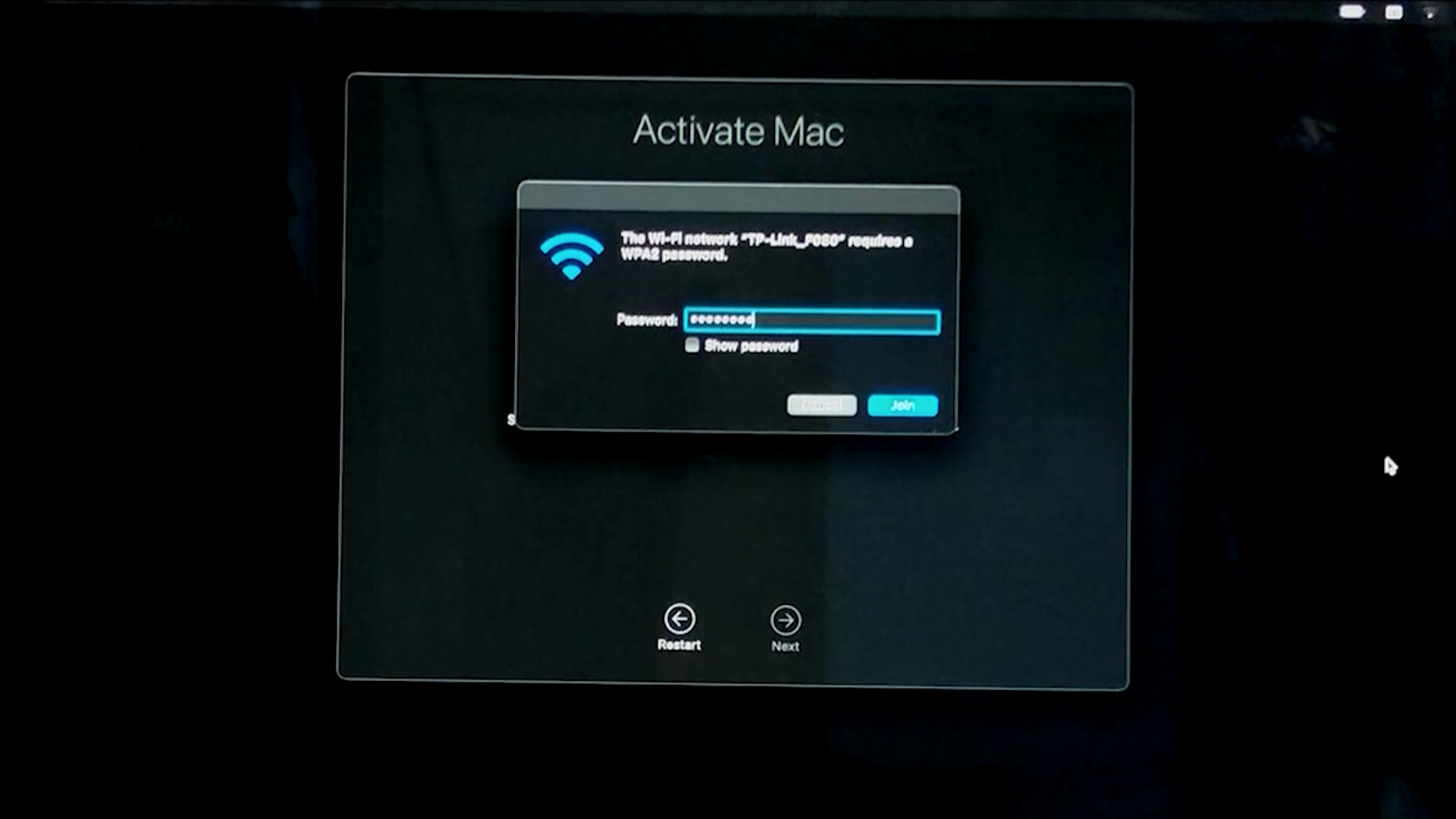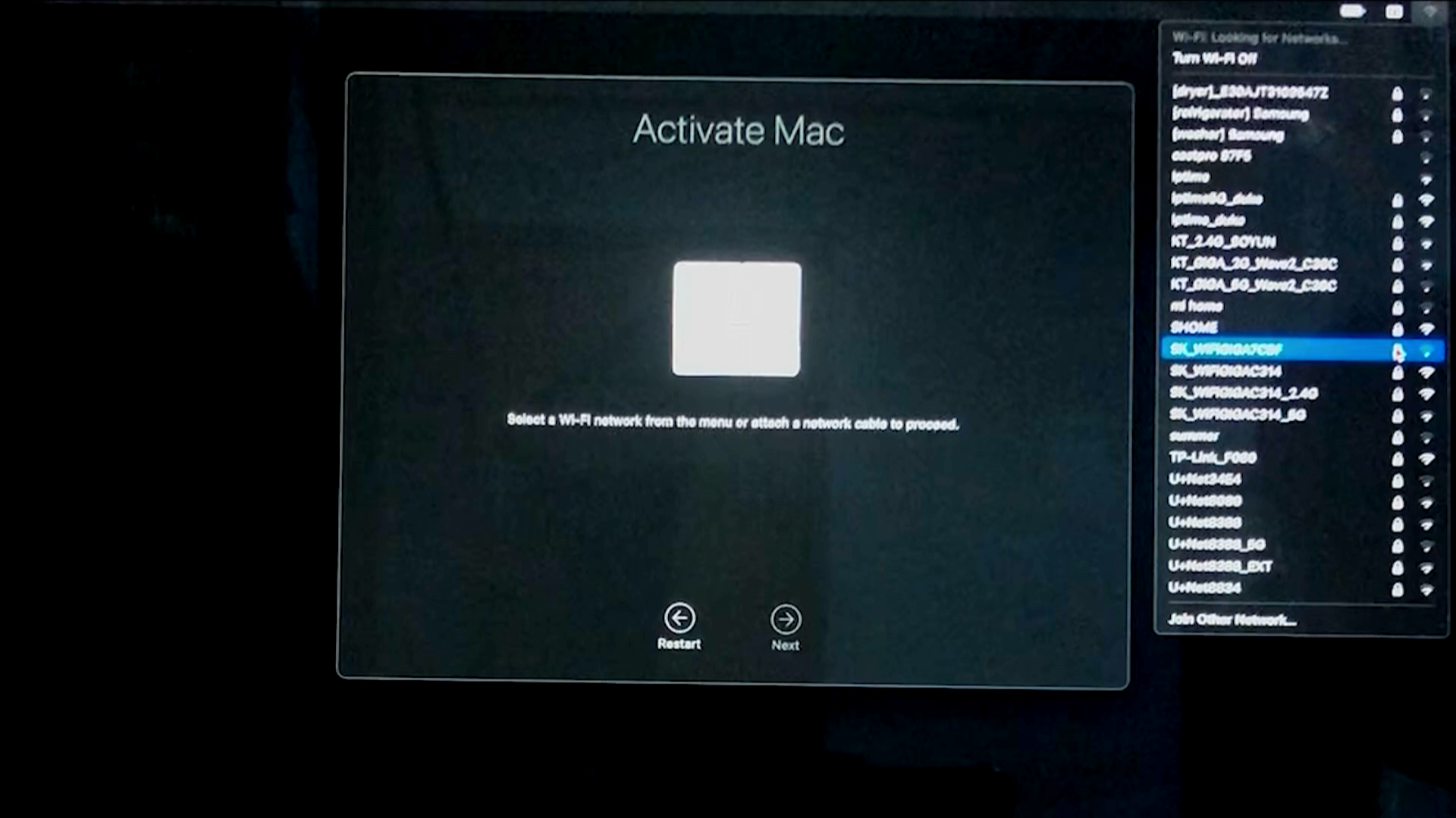 Activate Mac 화면에서 우측 상단의 wi-fi 버튼을 클릭하여 공유기를 선택합니다.