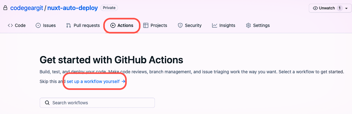레파지토리의 Actions 탭으로 이동하여 "set up a workfolow yourself"를 클릭합니다.