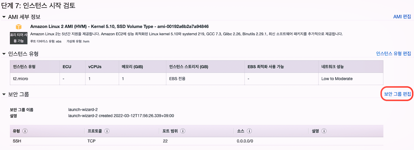t2.micro를 선택하고 검토및시작 버튼을 클릭합니다.