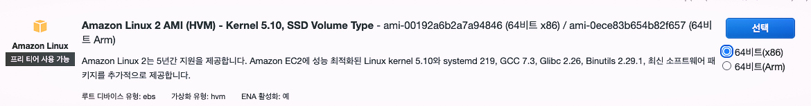 무료로 사용할 수 있는 Amazon Linux 2 AMI를 선택합니다.