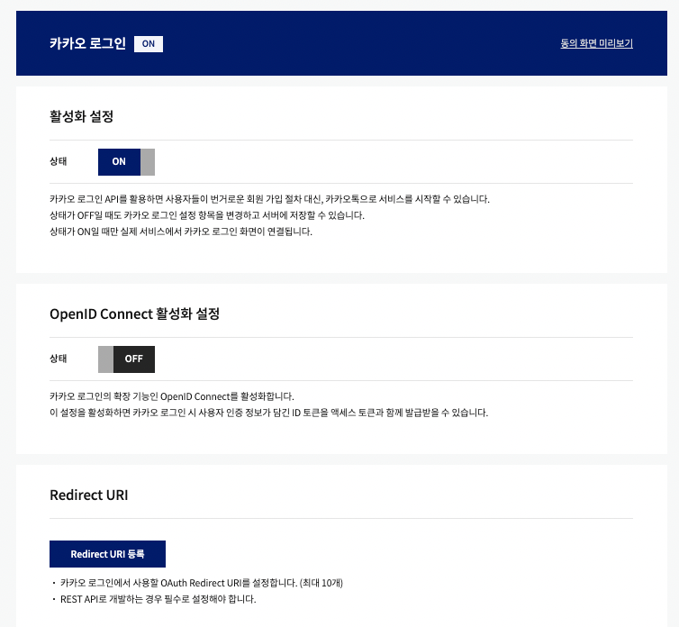 9. 우선 로그인 기능을 사용하기 위해 "활성화 설정"을 ON으로 변경합니다. 그리고 하단의 "Redirect URI 등록" 버튼을 클릭합니다.