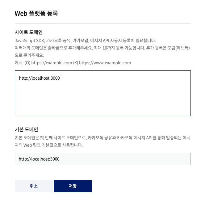 우선은 로컬에서만 개발을 진행하므로 "http://localhost:3000"을 등록합니다.(3000은 포트입니다.)