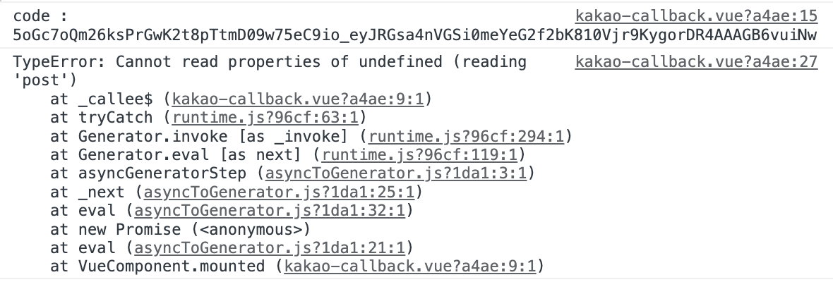 브라우저의 콘솔을 확인해보면 다음과 같이 code 값이 넘어온것을 확인 할 수 있습니다.