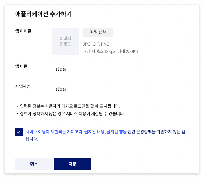- 동의 항목은 카카오 로그인시 가져올 수 있는 고객의 정보를 선택하는 화면입니다.