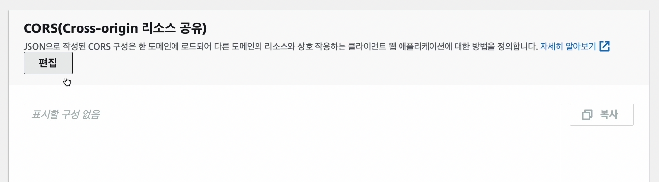 - CORS 항목에서 "편집"을 클릭한 후 다음 내용을 입력합니다.