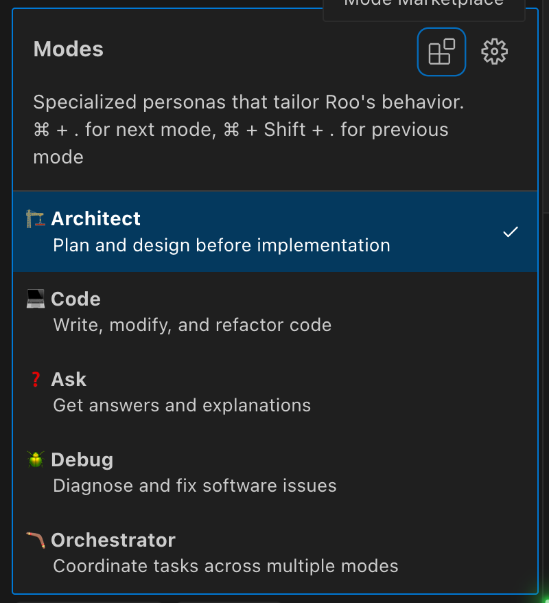RooCode AI의 경우 Architect 모드로 시작 하였고, 계획이 수립되면 Code 모드로 변경하였습니다.