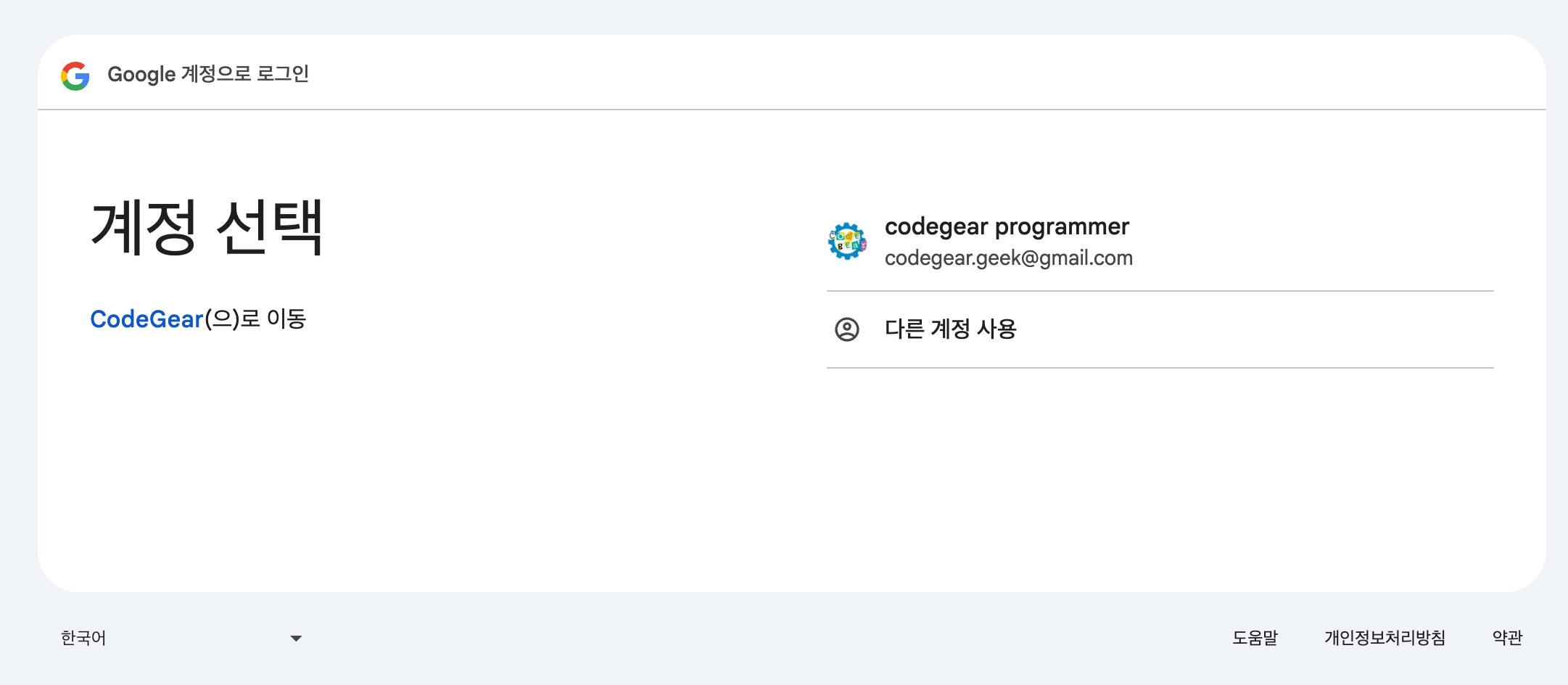 CodeGear 서비스 로그인 안내창에서 "계속" 버튼을 클릭하면 로그인이 완료되고 로그인한 사용자 정보가 표시됩니다.