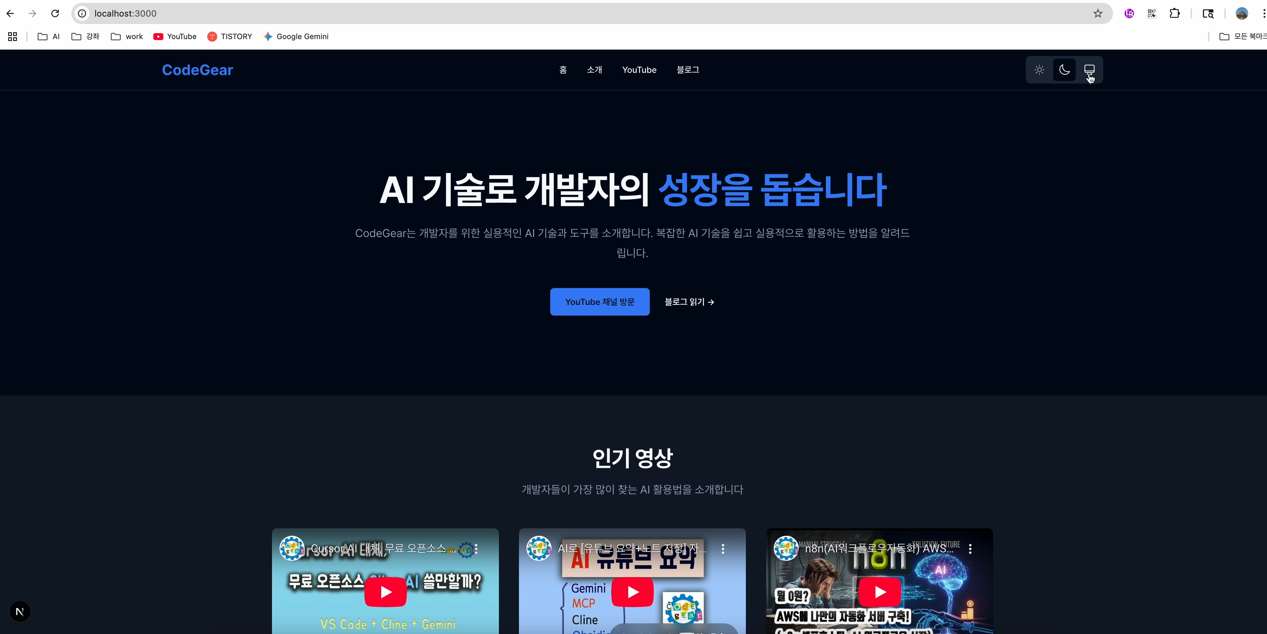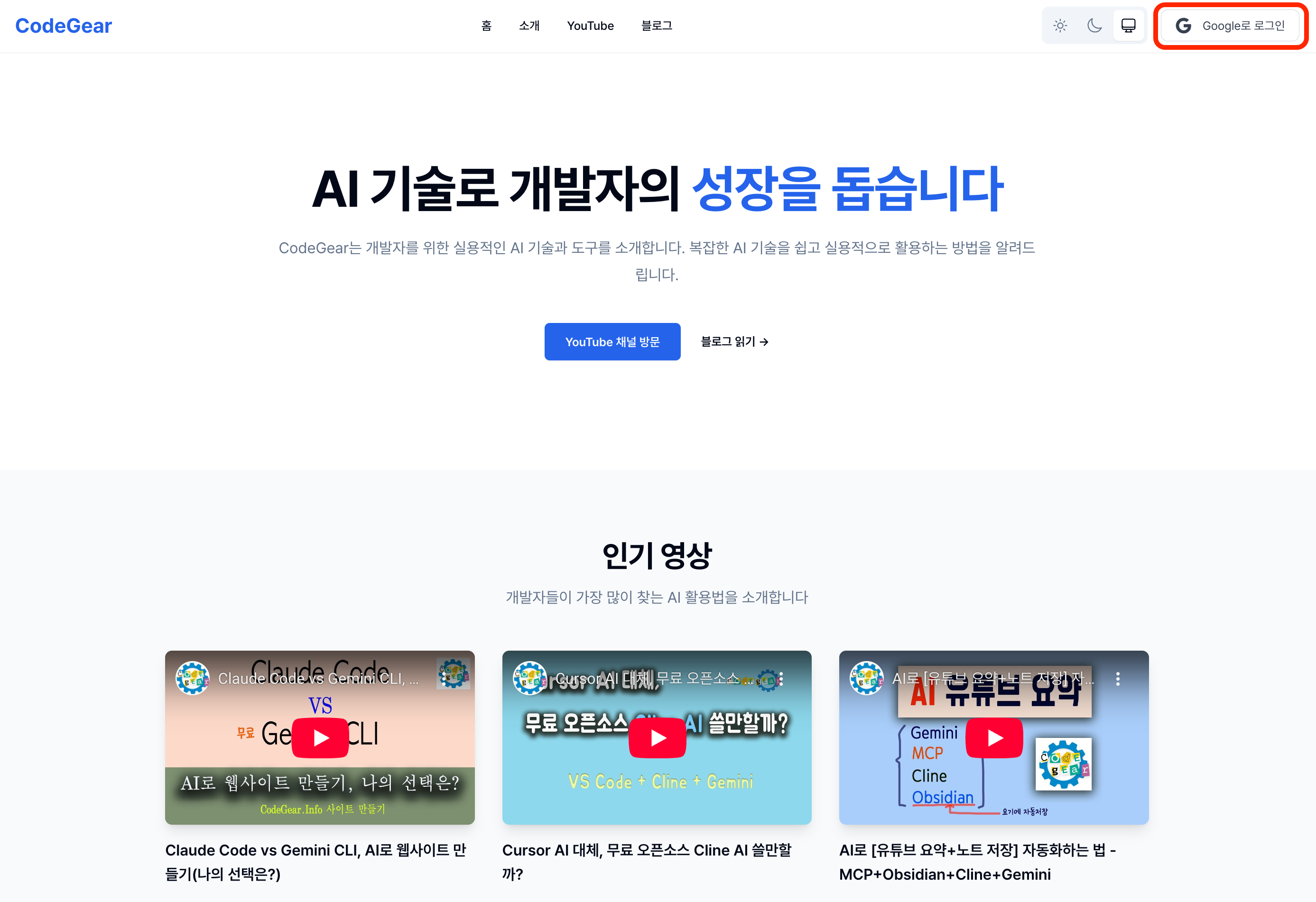 - **사이트 목적:** 이 사이트는 AI 특히 프로그램 개발과 관련된 AI 기술을 소개하는 CodeGear의 유튜브와 블로그를 소개 및 홍보하기 위한 것