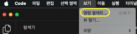 VSCode의 메뉴에서 "보기-명령 팔레트"를 선택하거나, 단축키 Command+Shift+P를 누릅니다.
