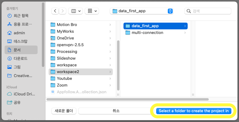입력 후 "Select a folder to create the projec in"을 클릭합니다.