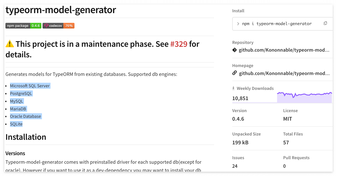 typeorm-model-generator는 아래와 같이 여러 db engine을 지원합니다.