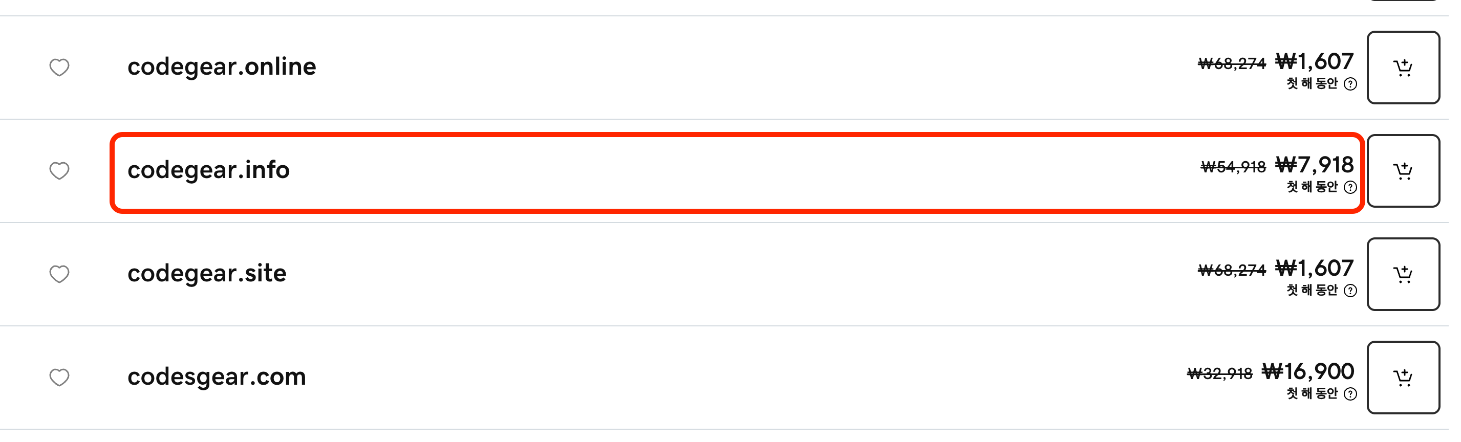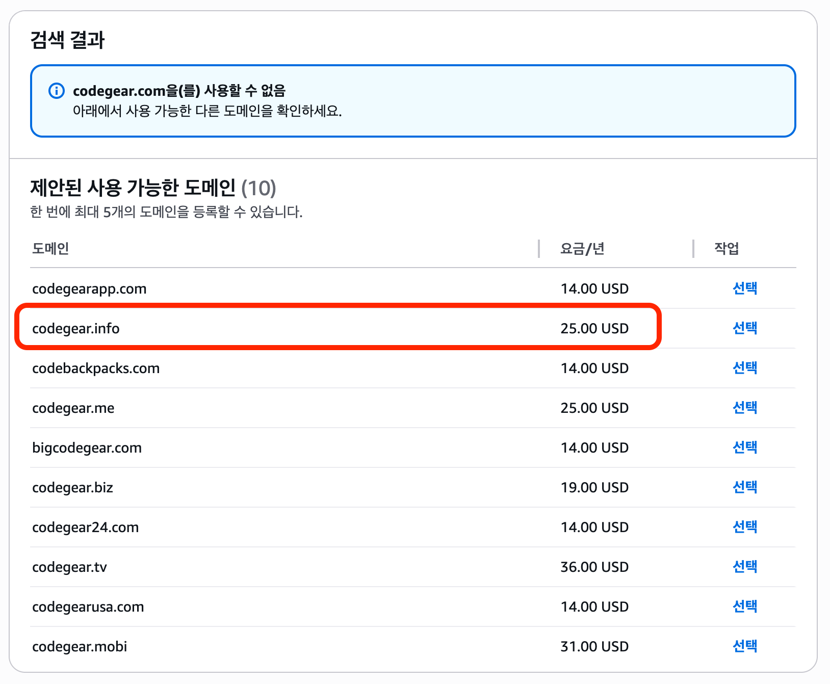 "도메인 이름" 필드에 다른 곳에서 구매한 도메인 이름을 정확하게 입력합니다 (예: codegear.info).