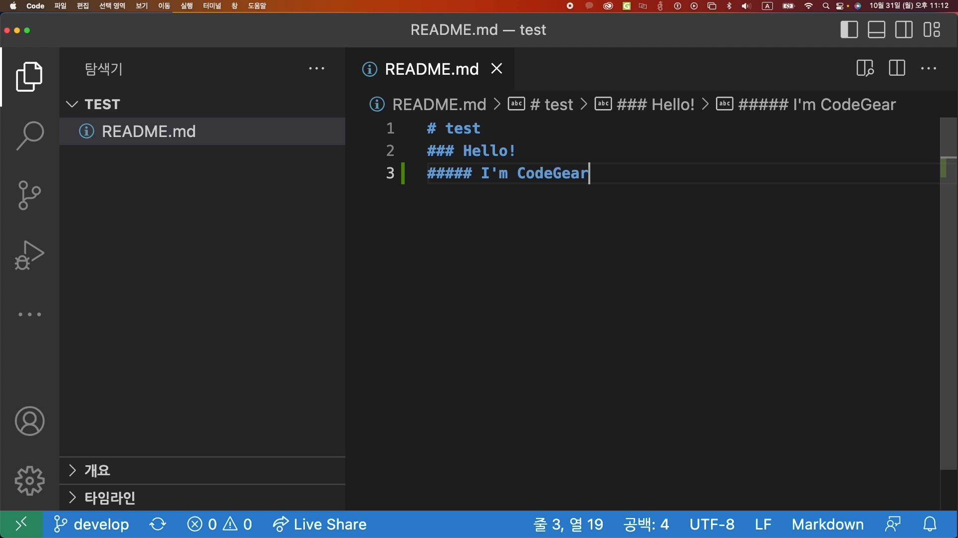 develop branch의 소스를 변경한 후 main에 merge 하는 방법입니다.