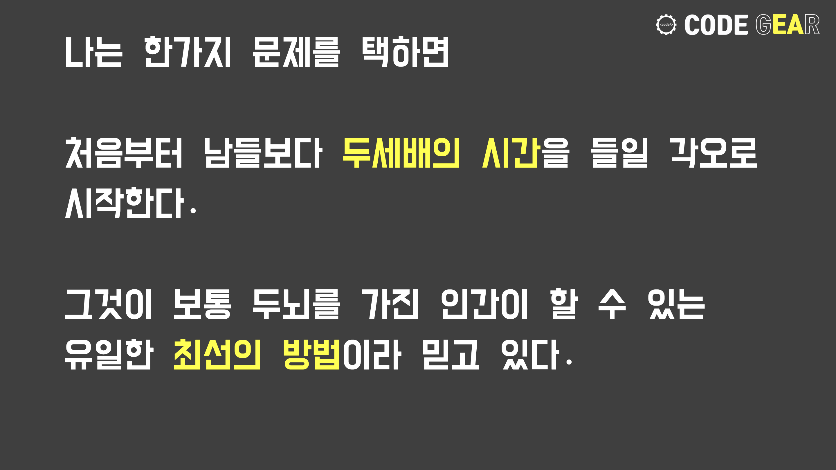 개발자들이 매일 하는 것은 코딩, 테스트, 코딩, 테스트의 반복입니다. 심지어 개발하고 있는 것이 잘 풀리지 않아, 몇일 동안 골머리를 앓기도 합니다. 하지만 이것을 어떻게든 해내야만 하는게 현실의 개발자입니다. 이런 끈기야 말로 개발자가 갖추어야 할 자질이기도 합니다.