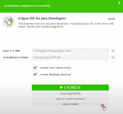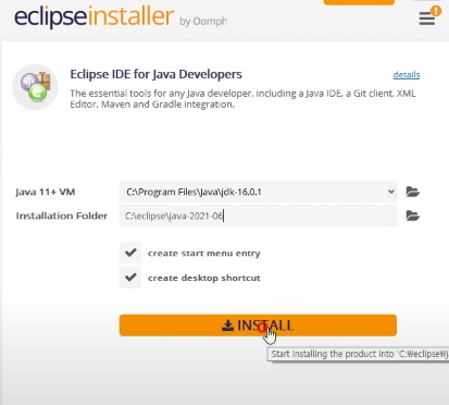 C:\eclipse\java-2021-06 폴더 지정 후 INSTALL 버튼을 클릭합니다.