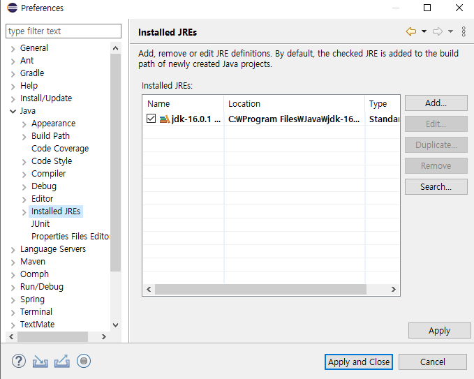 만약 없을 경우 우측의 Add 버튼을 클릭 하여 설치된 JDK 폴더를 지정해주시면 됩니다.