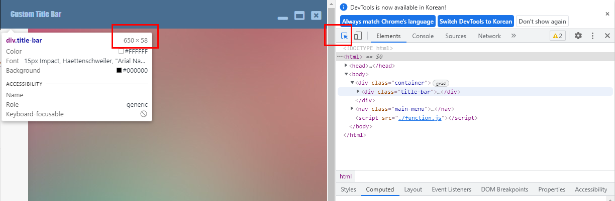- 실행화면에서 타이틀바의 높이를 확인합니다.