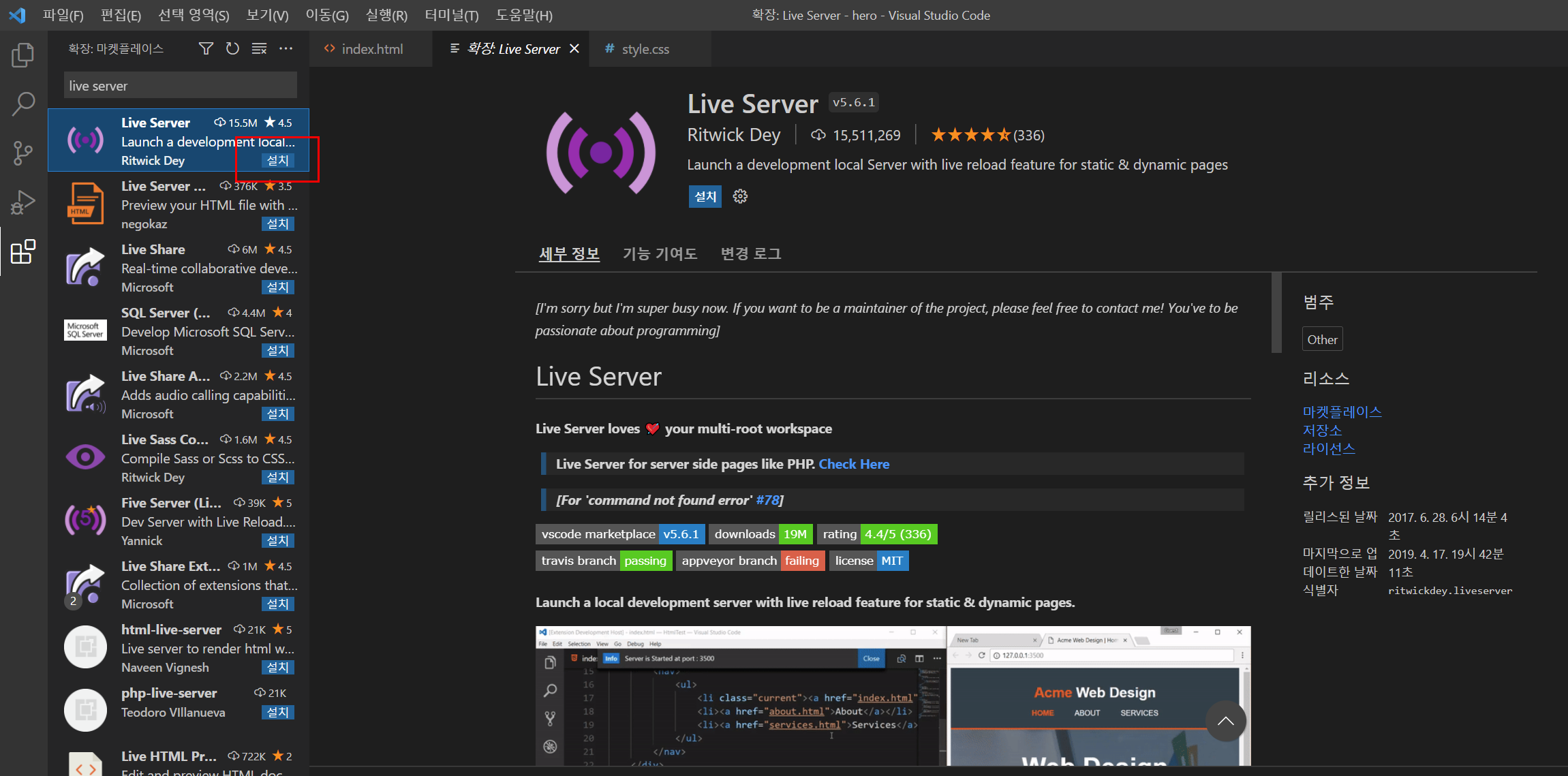 - VSCode의 extention에서 Live Server를 검색하여 설치합니다.
