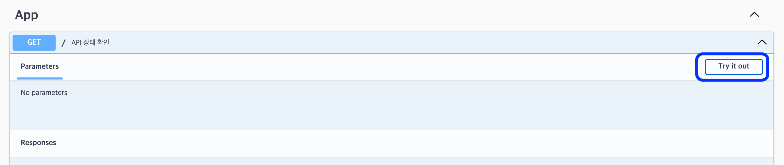 - 제일 첫번째에 있는 API 상태 확인을 클릭하고 "Try it out" 버튼을 클릭합니다.