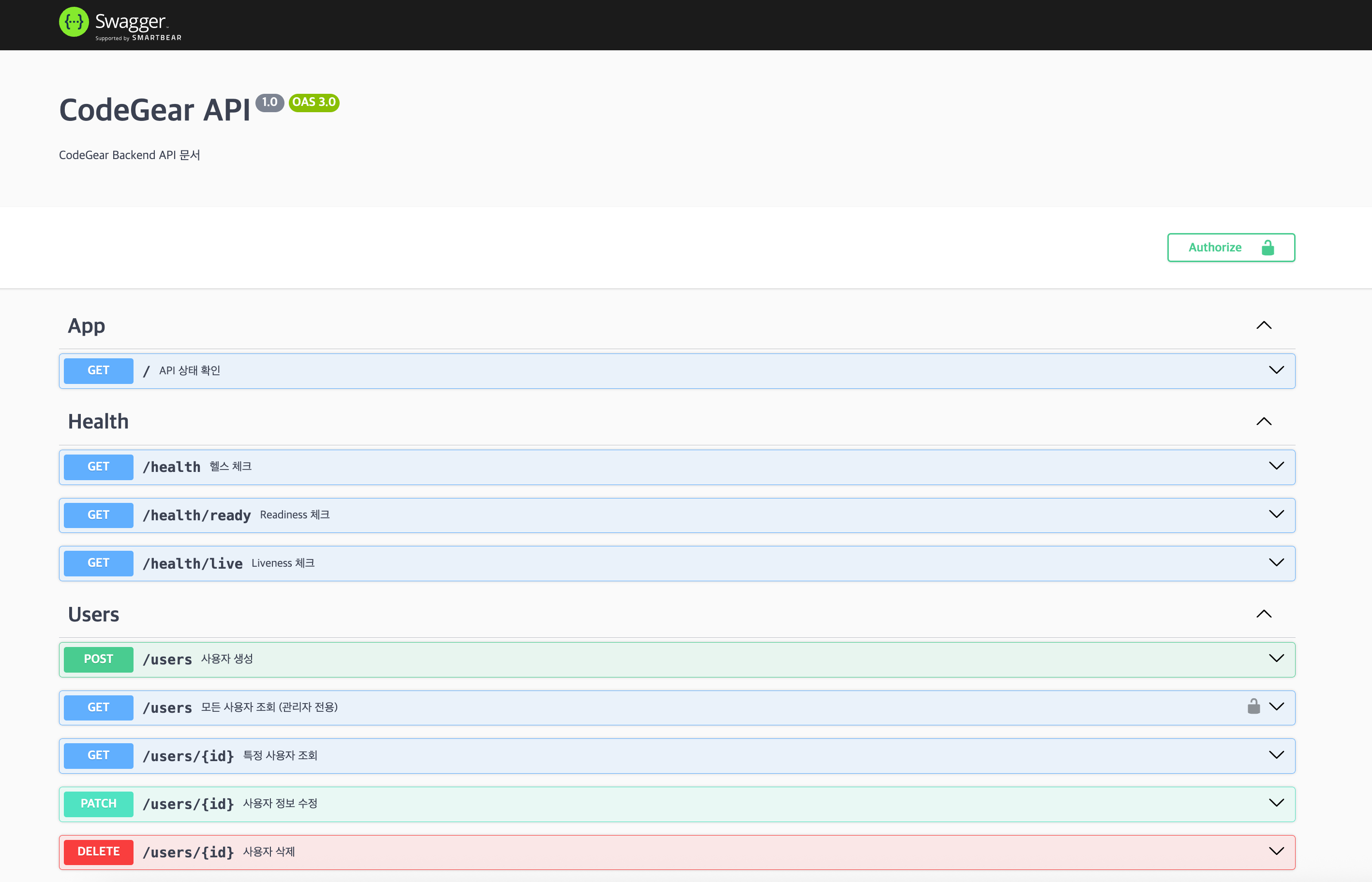 - **사이트 목적:** 이 사이트는 codegear.info의 backend API 서비스를 담당한다