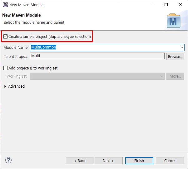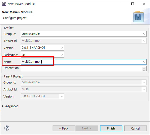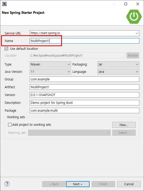 - Child 프로젝트인 MultiProject1을 아래와 같이 생성합니다.