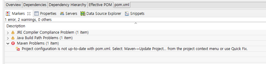 - pom.xml을 변경하면 프로젝트에서 아래와 같이 오류 메시지가 나옵니다.