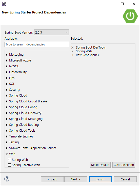 - 다음 화면에서 다음 Dependency 들을 선택합니다.(검색창에서 조회하시면 됩니다)