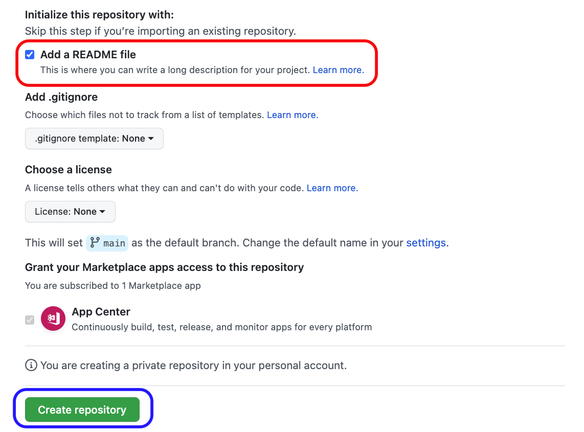 - [Add a README file] 이라고 된 부분을 체크하고, [Create repository] 버튼을 클릭하여 프로젝트를 생성합니다.