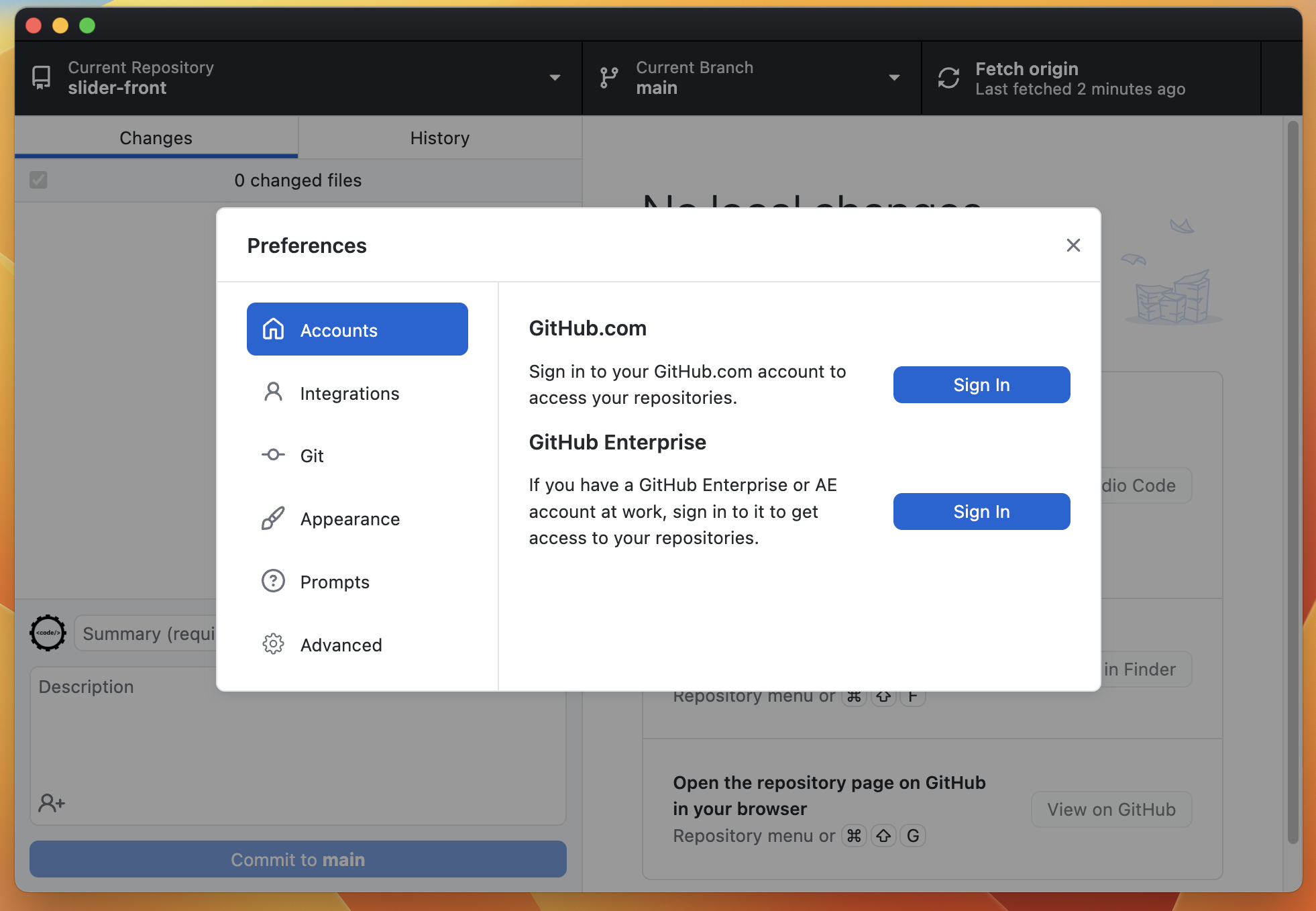 - [Accounts] 메뉴에 들어가면 Github.com 항목의 [Sign In]을 클릭합니다.
