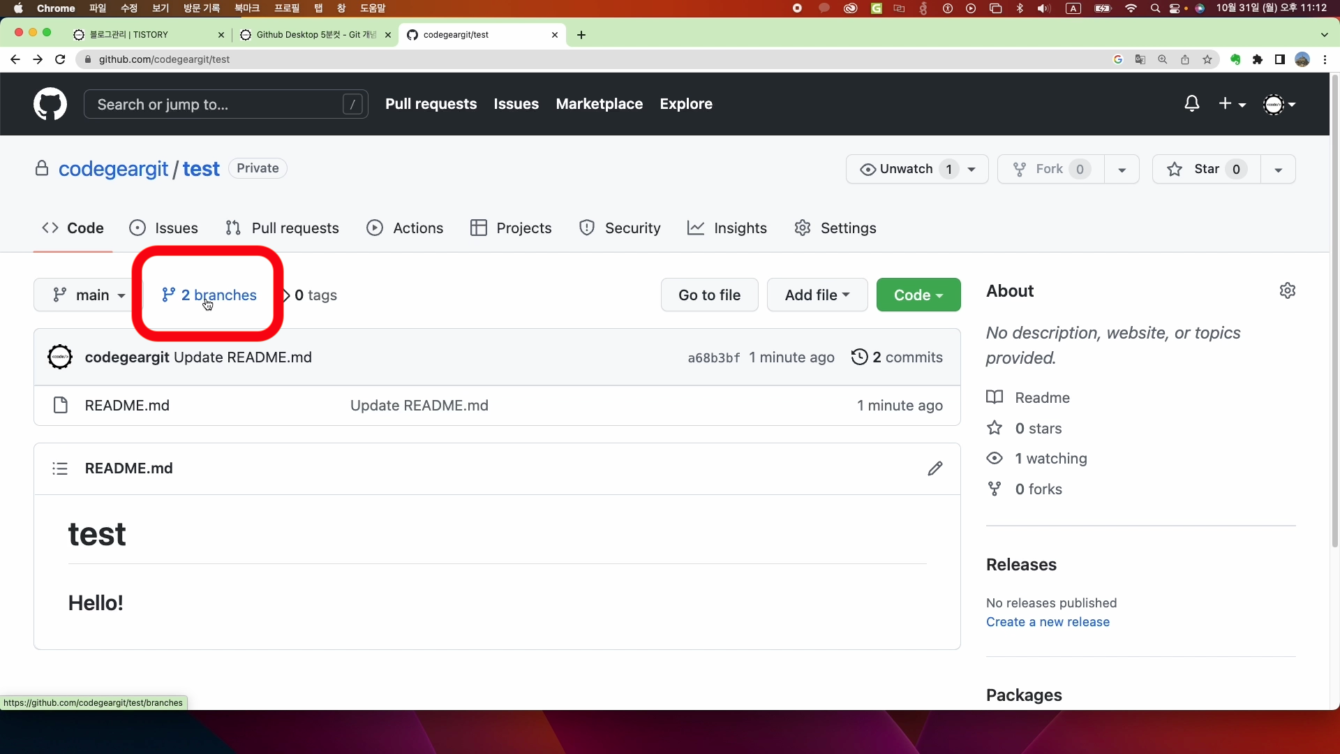 - github.com에서 새로고침해보면 branch가 2개가 된것을 확인할 수 있습니다.