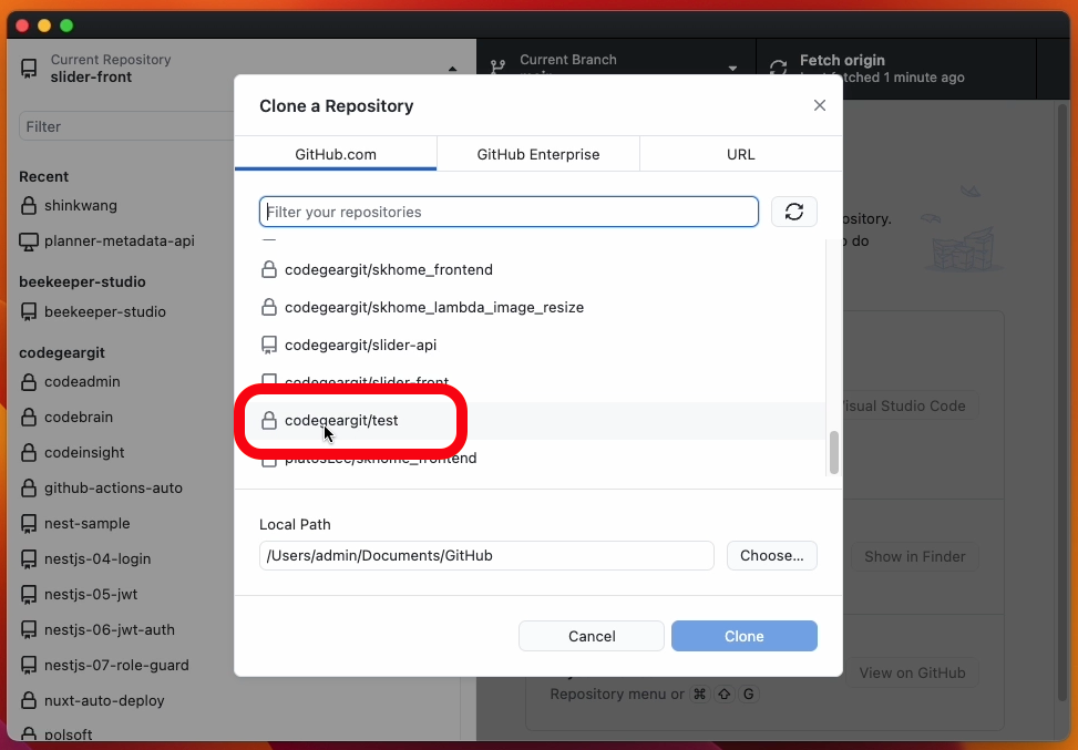 - github.com tab을 클릭한 후 test repository를 선택하고 clone 버튼을 클릭하면 소스가 다운로드 됩니다.