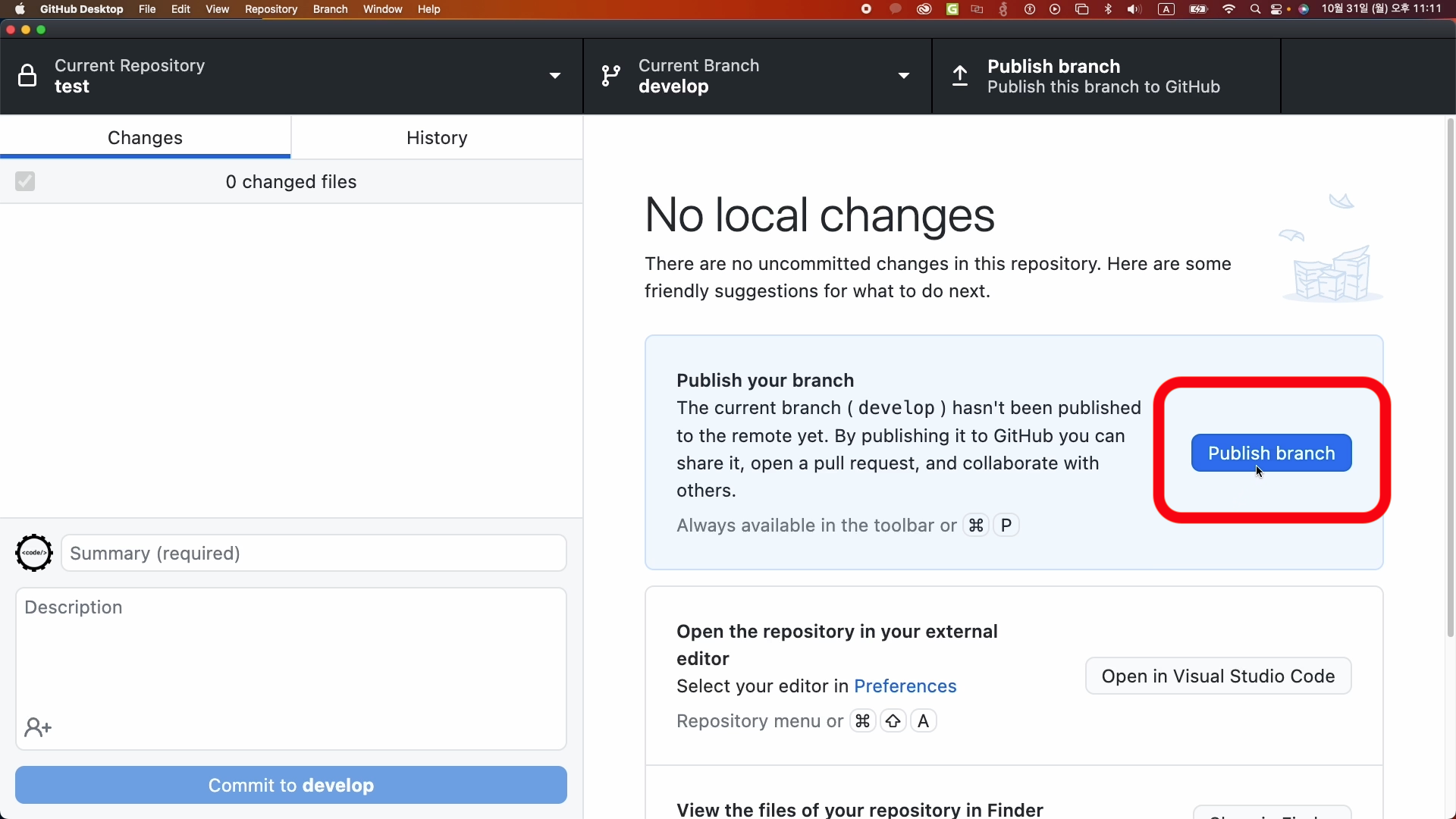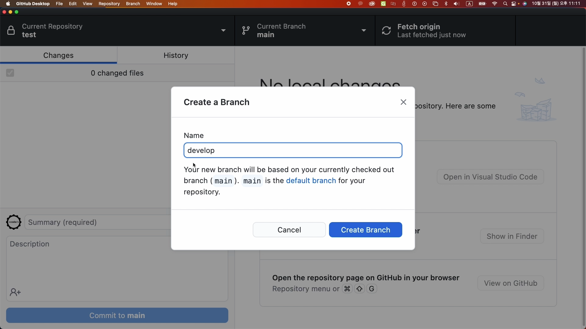 - 브랜치명을 "develop" 이라고 입력하고 "Create Branch"를 클릭합니다.