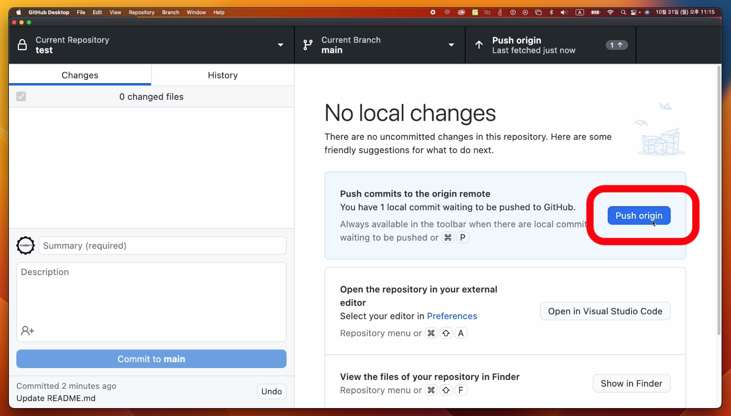 - "Push origin" 버튼을 클릭하면 Merge가 완료됩니다.